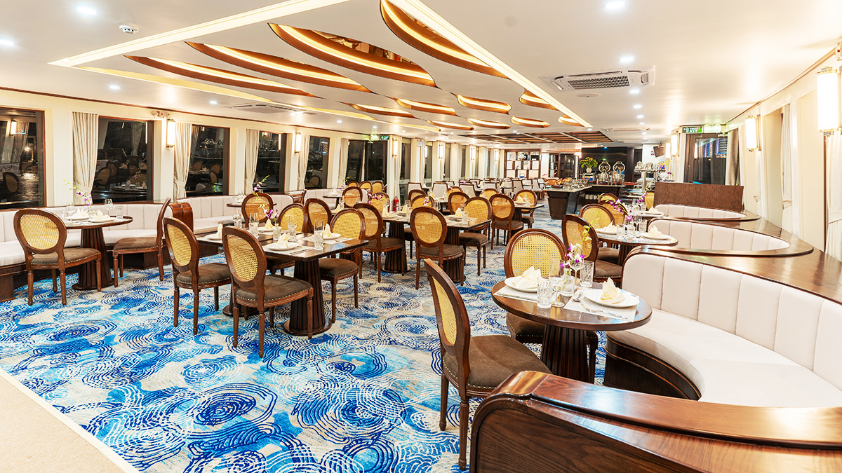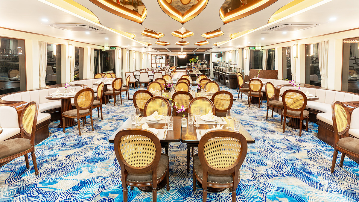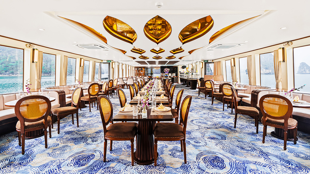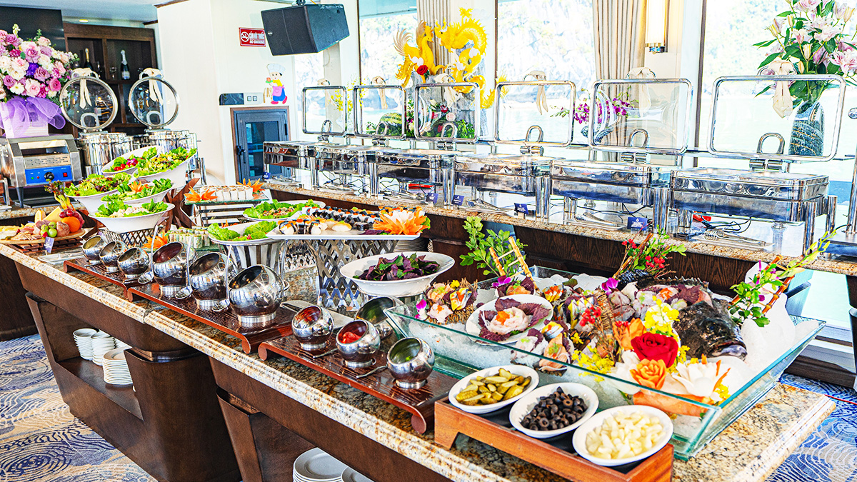 Thực đơn là sự kết hợp hài hoà và đa dạng của ẩm thực Á - Âu. Nguyên liệu chính là những hải sản tươi ngon được đánh bắt ngay trong vịnh Hạ Long bởi ngư dân bản địa.
