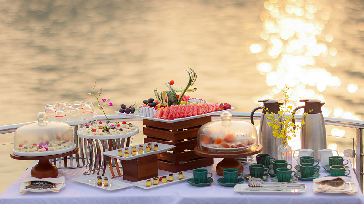 19:15 - 20:15: Symphony Cruise dừng đỗ tại điểm neo đậu. Lúc này, bữa tối đã sẵn sàng. Quý khách sẽ hoà mình vào không gian sang trọng của nhà hàng tại tầng 1 để thưởng thức tinh hoa ẩm thực được tạo nên bởi đầu bếp 5 sao trên tàu.