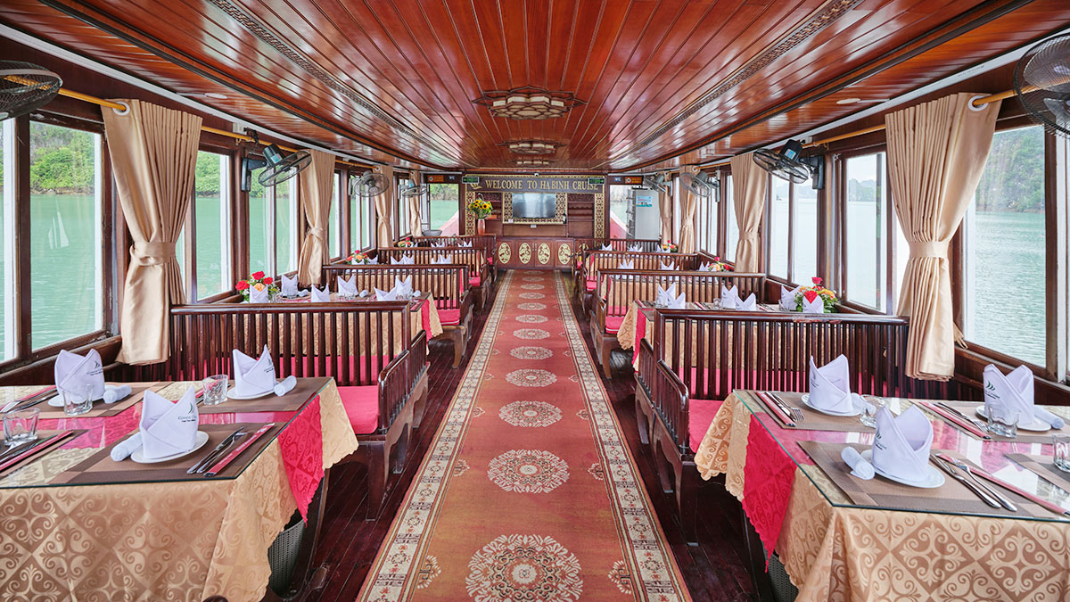 - Tàu gỗ 48 khách mát mẻ và thông thoáng, ít khách.